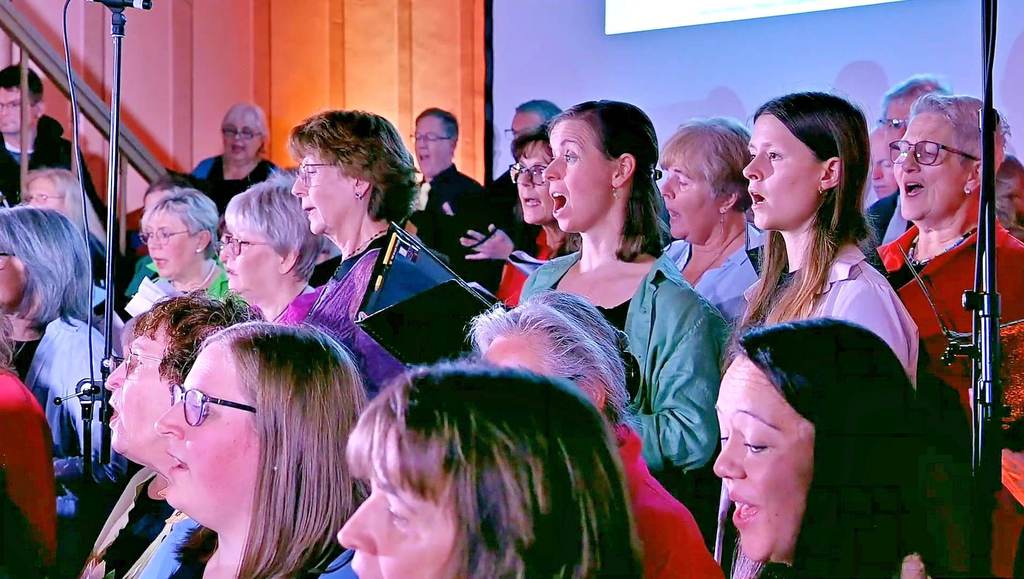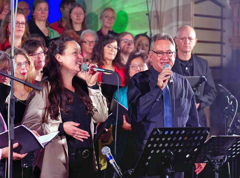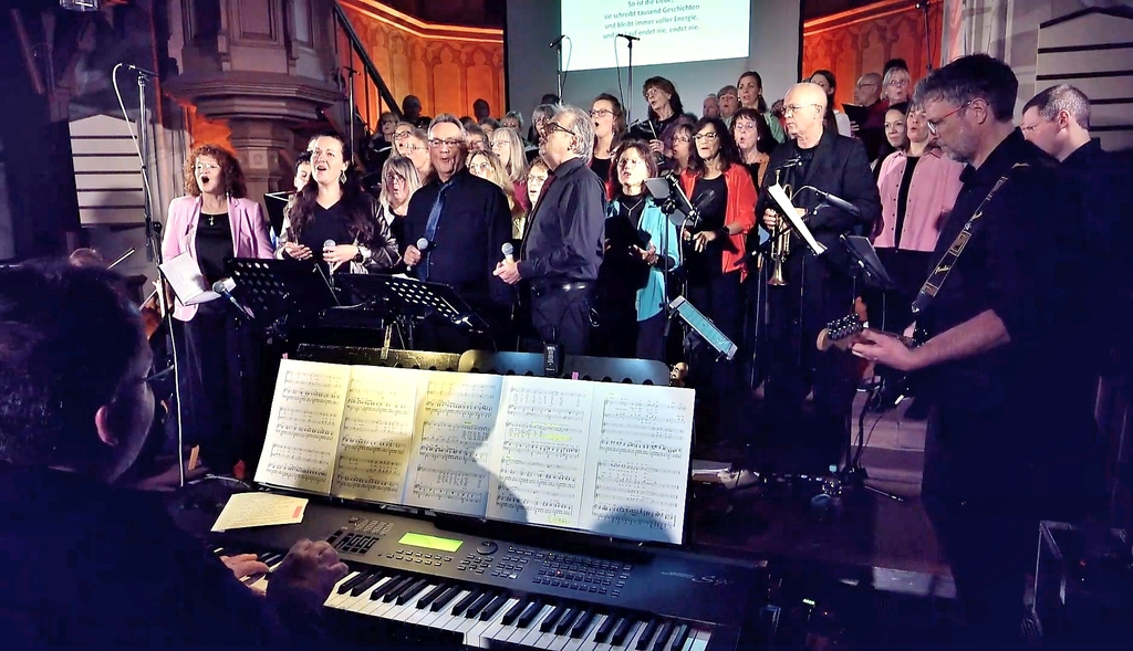 Der Song „Neues Zeitgefühl“ (4. Gebot) lud mit einem swingenden Groove zum Lächeln ein: „Fröhlich Zeit verschwenden, Arbeit ist verboten. Nichtstun ist erlaubt – ja, das wäre Paradies auf Erden.“ Bei „Geben macht glücklich“ (8. Gebot) sprang der Funke endgültig über – Chor und Publikum klatschten im Rhythmus, losgelöste Freude schaffte sich im vollen Kirchenschiff Platz. „Geben, das macht glücklich. Gott legt darauf seinen Segen – Lob und Freude werden strömen wie ein warmer Frühlingsregen.“